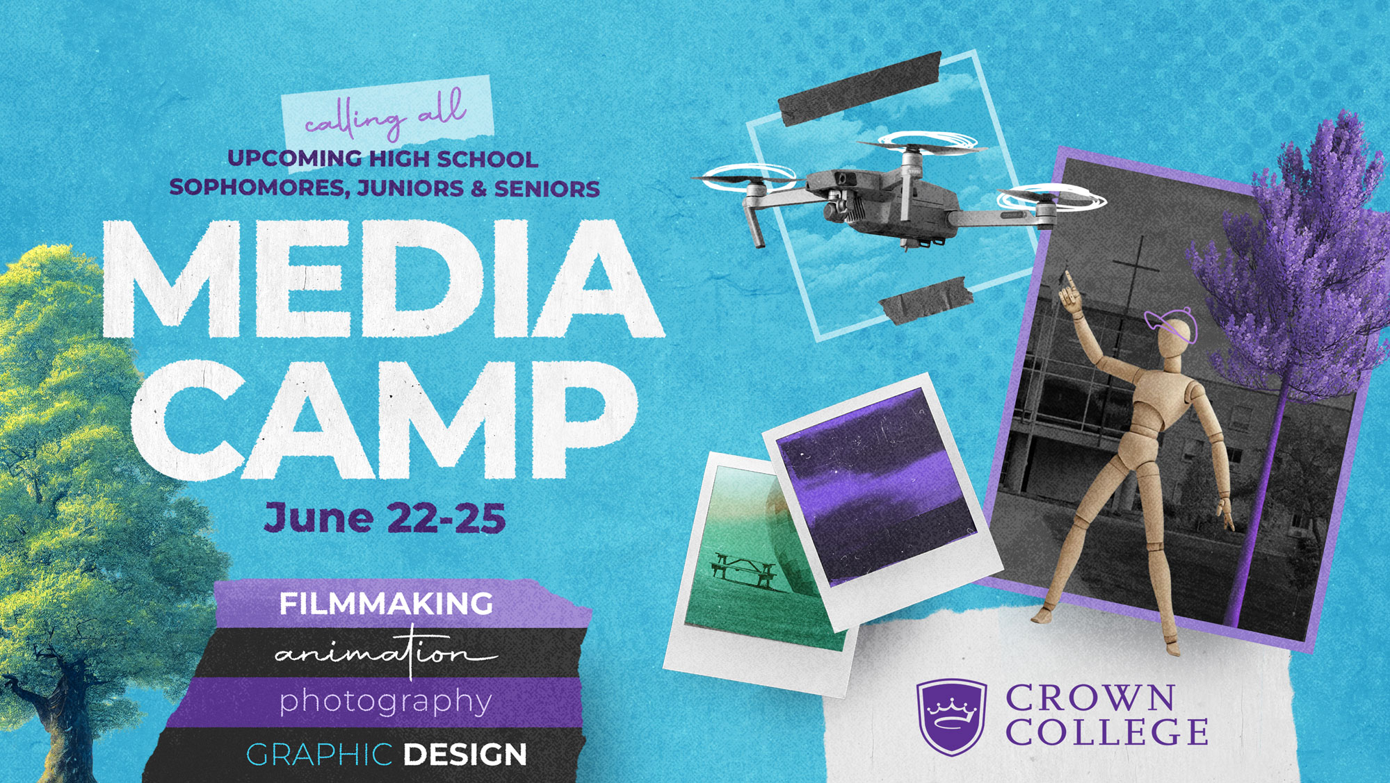This week-long experience is designed for high school sophomores, juniors, and seniors (as of the 2026-27 school year) who are eager to dive into the world of media. Whether students are beginners or already have some artistic or technical experience, our sessions offer something for everyone. Over four full days, campers will explore hands-on sessions in filmmaking, advanced cinematography techniques, screenwriting, stop-motion animation, double exposure photography, drone cinematography, Photoshop techniques, and more. Every session will be led by Crown College Media Arts faculty and/or industry professionals, with additional assistance from current Crown College students.